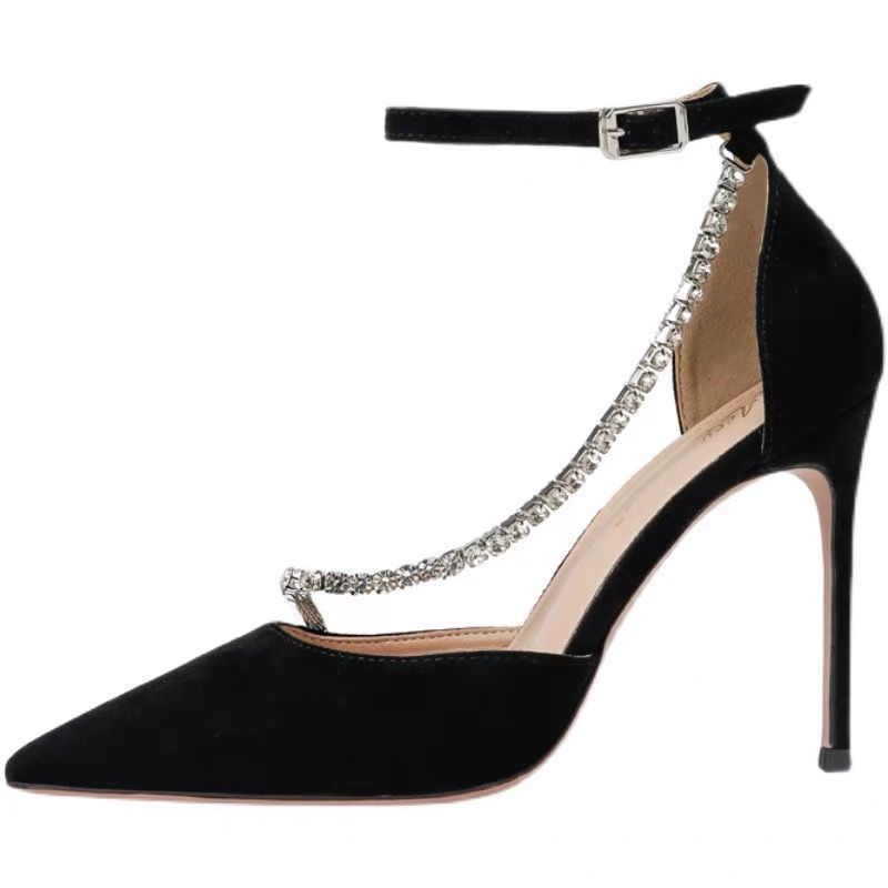 2025 New Ocean Gas Fine Tip Point Single Shoe Head One-Word Buckle Drill Sandals Black High-Heeled Shoes HZ0115