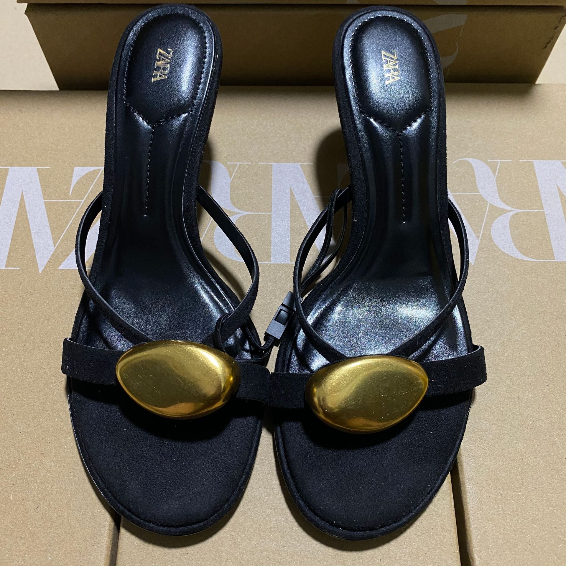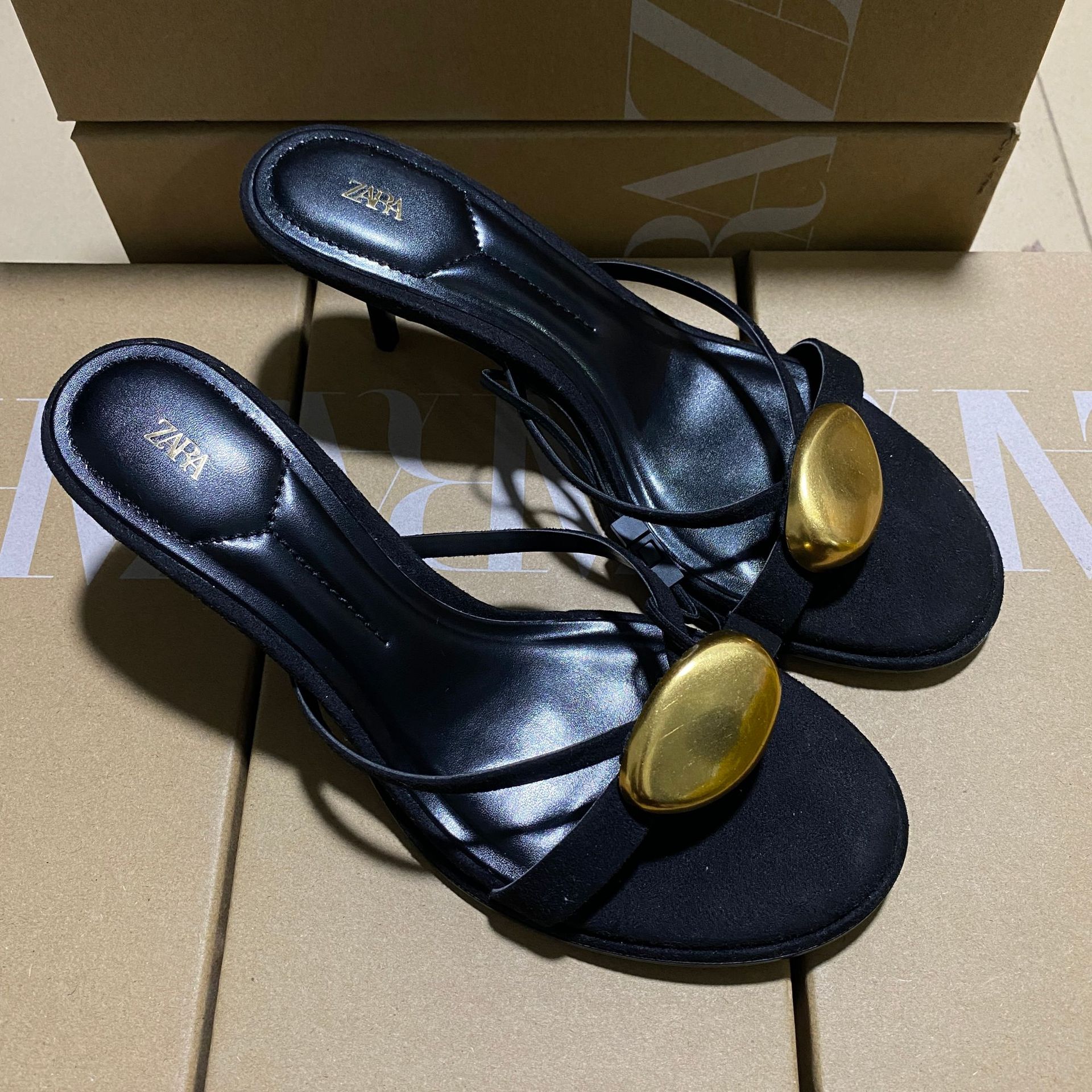 ZAJ2025 Spring New Women's Shoes Black Metal Details Decorating Round Head Fine High Heel Elegant Fashion Sandals HZ0115